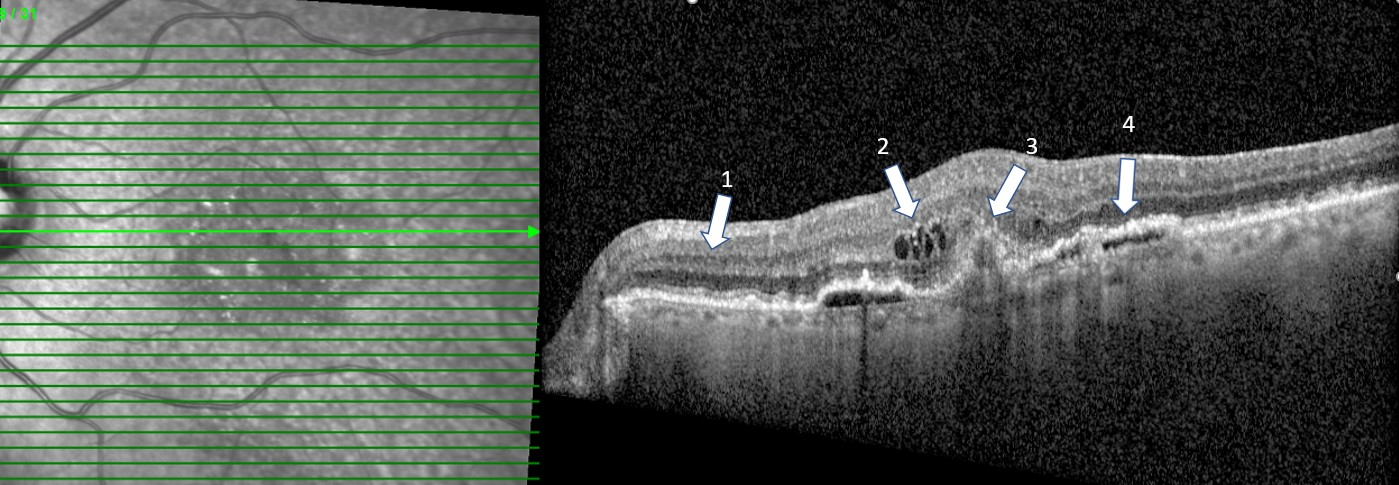 When we look at an OCT, we look at a cross section of the retina as shown in the left photo. The right photo is the cross section of the macula at the level of the bright green line shown on the left. (1) denotes a relatively normal retina. (2) represents retinal leakage (and thickening) within the retina or intraretinal edema (3) presents neovascularization or abnormal vessels below the retina that are the source of leakage, i.e. wet or exudative macular degeneration (ARMD) and (4) represents a different type of exudative macular degeneration with leakage under the retina. It is not important to understand the different layers of the retina and/or the degrees of leakage but to recognize that the OCT is the most critical test we do in order to diagnose, treat, and follow exudative macular degeneration.