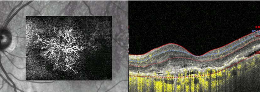 This represents OCT Angiography or OCTA. It is a major advancement on the technology of OCT. Not only can you see the cross section of the macula (on the right) but it actually will show the abnormal neovascularization (vessels responsible for exudation in exudative ARMD) as seen on the left. Not every eye care professional has this device. It is currently not reimbursed by insurance but it adds valuable information in the management of Exudative ARMD especially in patients who have persistent leakage despite multiple injections of anti-VEGF agents.